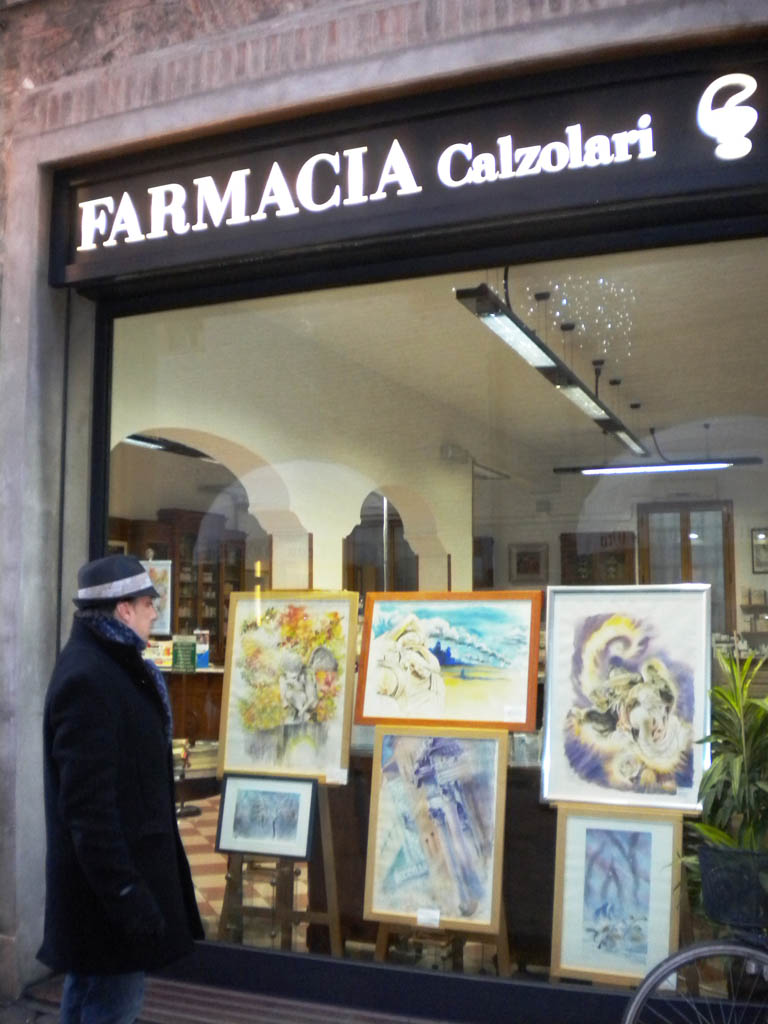 una vetrina di acquerelli e poesie (di Andrea Masiero) per la farmacia Calzolari